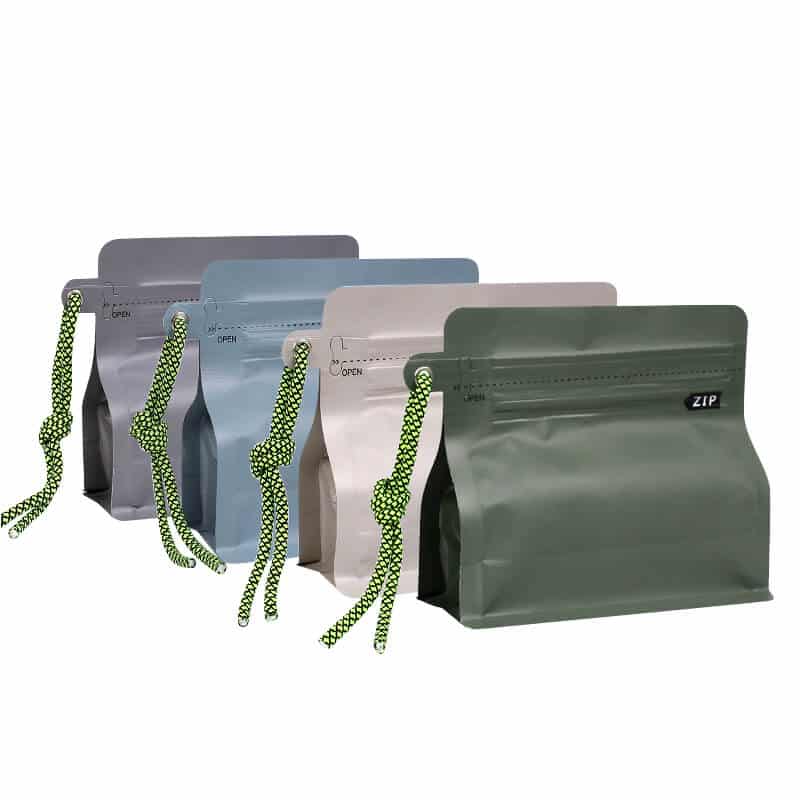 Una bolsa de fondo plano, también conocida como bolsa octogonal, cuenta con ocho bordes de sellado: cuatro en la base y dos alrededor de cada uno de los bordes superiores.